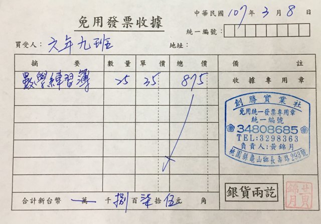 3/8 支出 數學練習簿 875元
